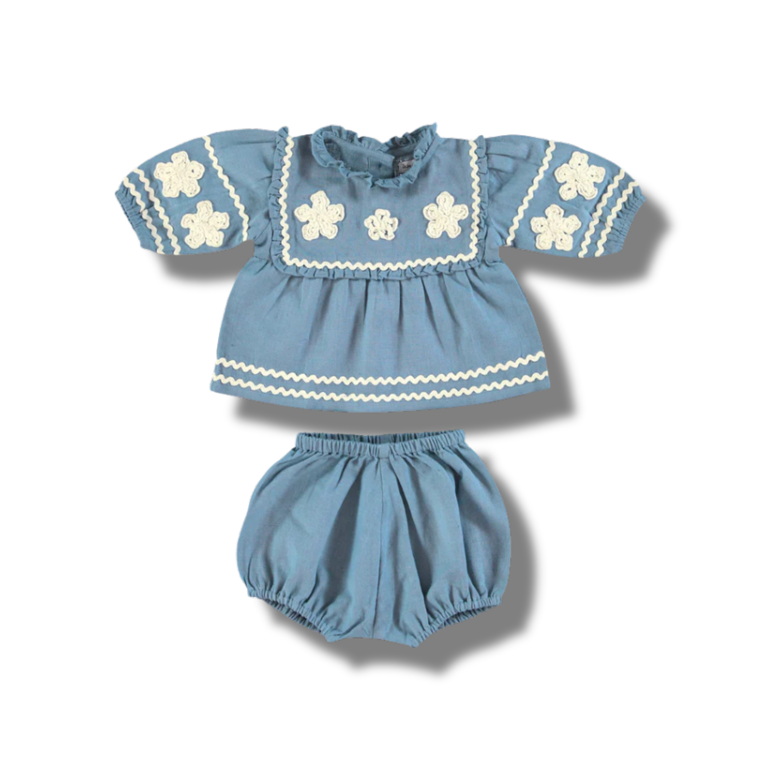 トップスには胸元と襟元に繊細なフリルをあしらい、ふんわりとしたバルーンスリーブが赤ちゃんらしい可愛さを引き立てます。さらに、ナチュラルホワイトのリックラックテープを装飾に取り入れ、クラシックでどこか懐かしい雰囲気に。セットのバルーンブルマーは丸みのあるシルエットで、赤ちゃんの愛らしさをいっそう強調してくれます。