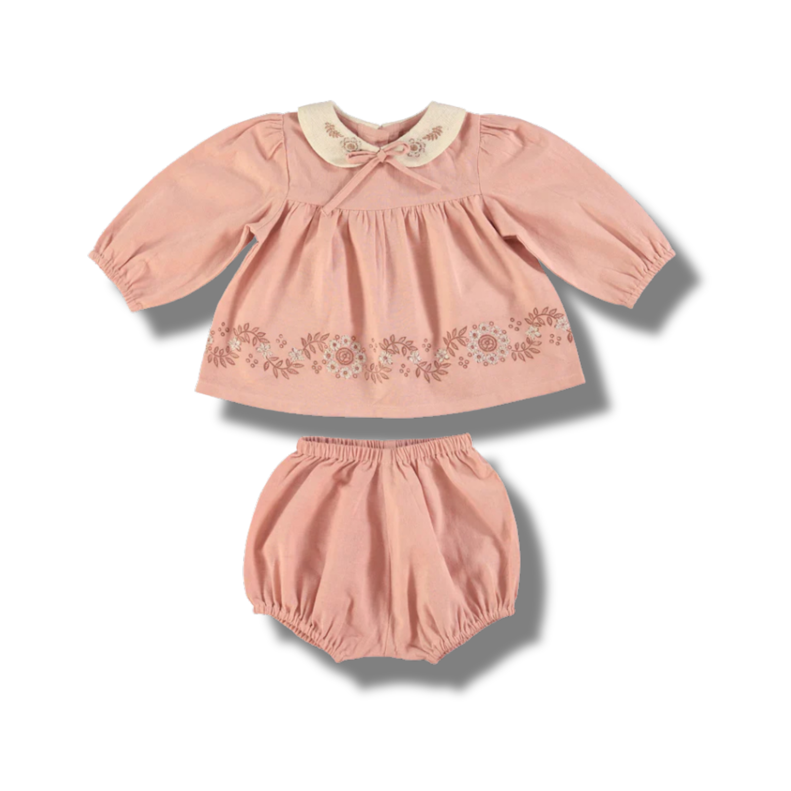 ブラウスはピーターパンカラーにブランドらしい刺繍を施し、フロントにはリボンタイのアクセント。バルーンシルエットの長袖と裾の刺繍が、ふんわりとしたクラシックな雰囲気を漂わせます。後ろには上品な光沢のシェルボタンをあしらい、ディテールまで美しく仕上げられています。セットのブルマは丸みのあるバルーンシルエットで、赤ちゃんらしい愛らしさを一層引き立てます。