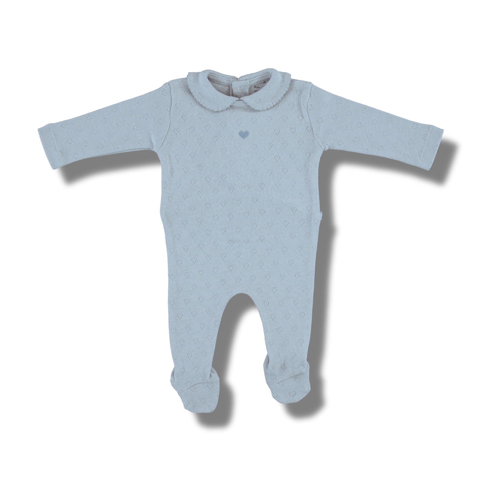 ブランドを象徴するハート柄のジャカードニットに、ピーターパンカラーと繊細なレースをプラス。袖は長袖仕様で、足先まですっぽり包み込むデザインだから靴下がなくても安心。