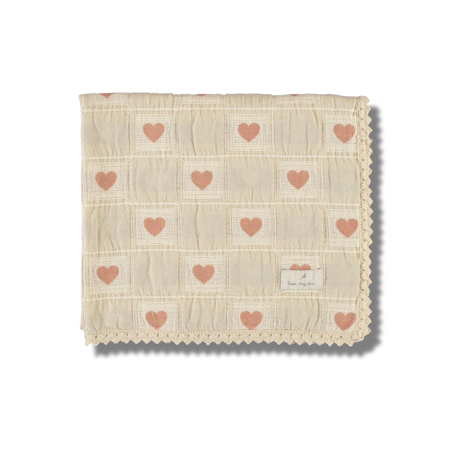 ジャカード織りのハート模様と、縁を彩る繊細なコットンレース。可愛らしさとクラシックな上品さを兼ね備えたデザインで、ベビーとの毎日を少し特別にしてくれます。100×75cmの扱いやすいサイズは、ベビーベッドやベビーカーにぴったり。軽やかで持ち運びもしやすいため、外出時にも重宝します。