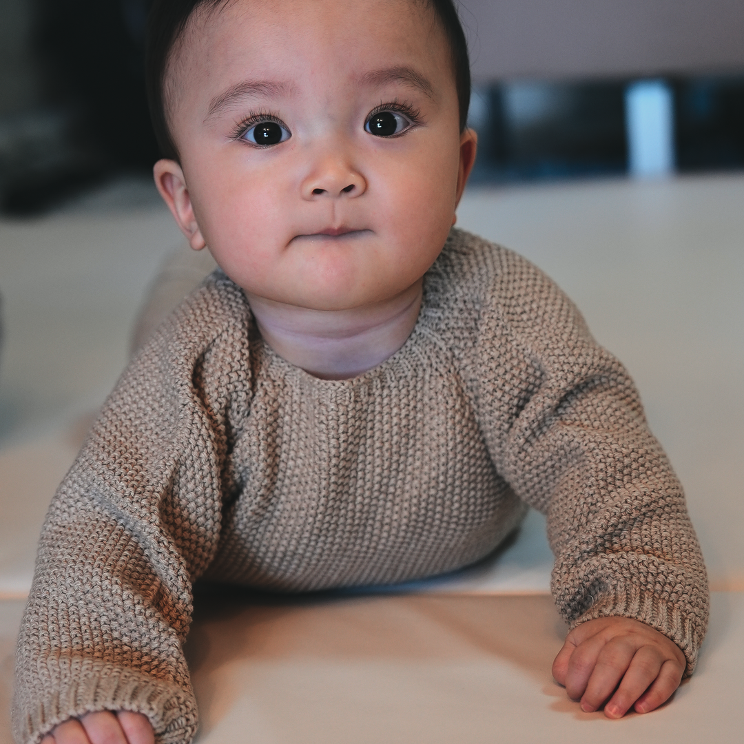 寝ている赤ちゃんにもストレスなく着せられて、羽織りにも、トップスとしても使える万能デザインです。