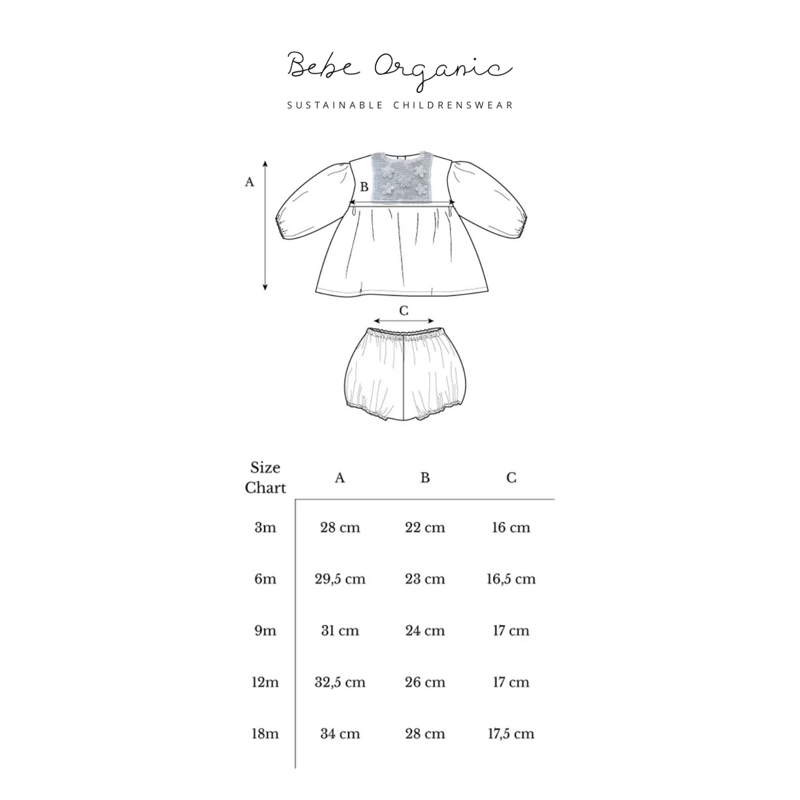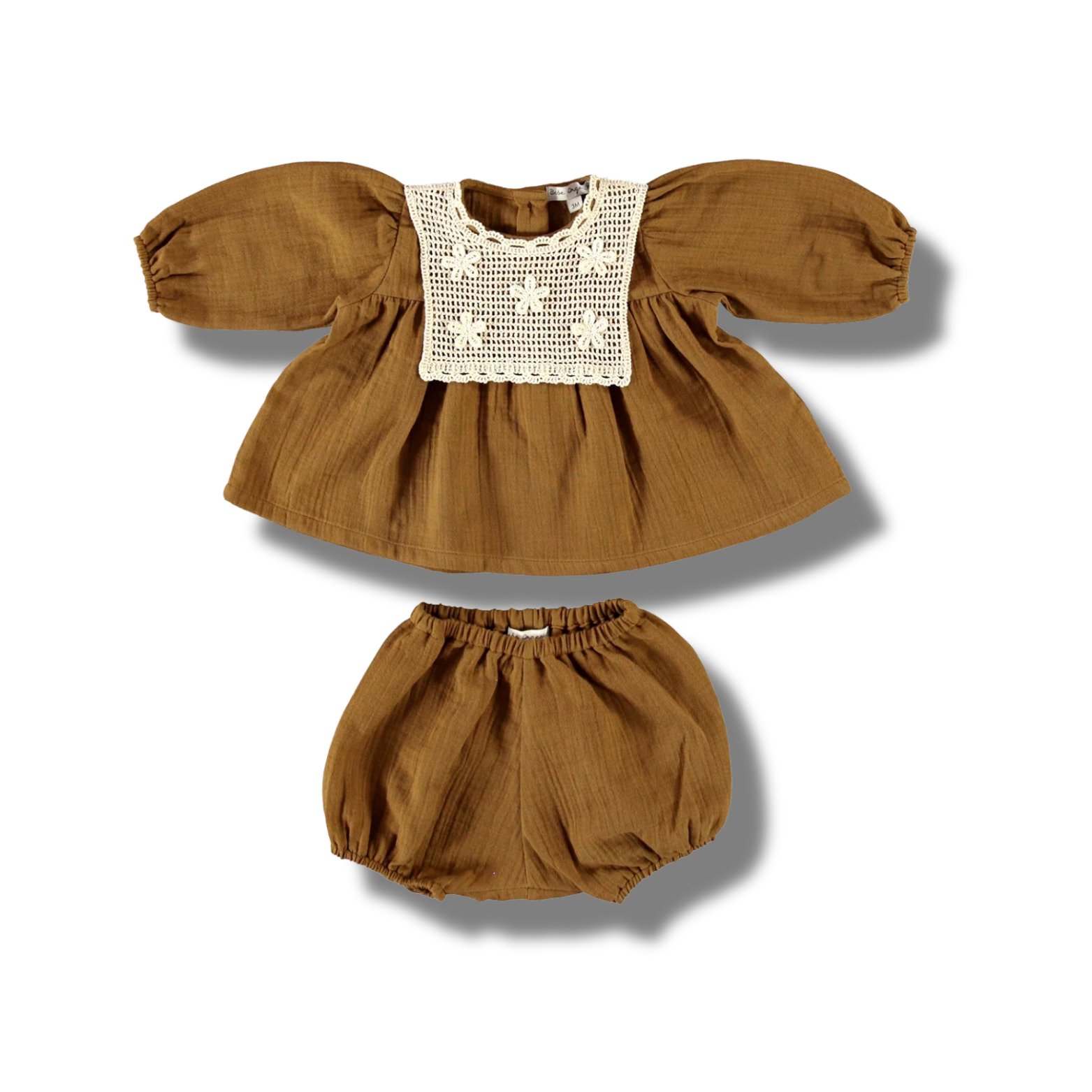 ブラウスにはBebe Organicを象徴する繊細なクロシェ編みの花柄カラーをあしらい、上品でクラシックな佇まいを実現。背面はシェルボタンで仕上げられており、自然な光沢が赤ちゃんの着姿を一層引き立てます。