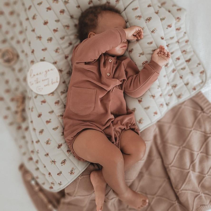 繊細な手触りと肌に優しい染料を使用し、柔らかくデザインされたロンパースは赤ちゃんにとっても動きやすく快適に過ごせるようデザインされております。