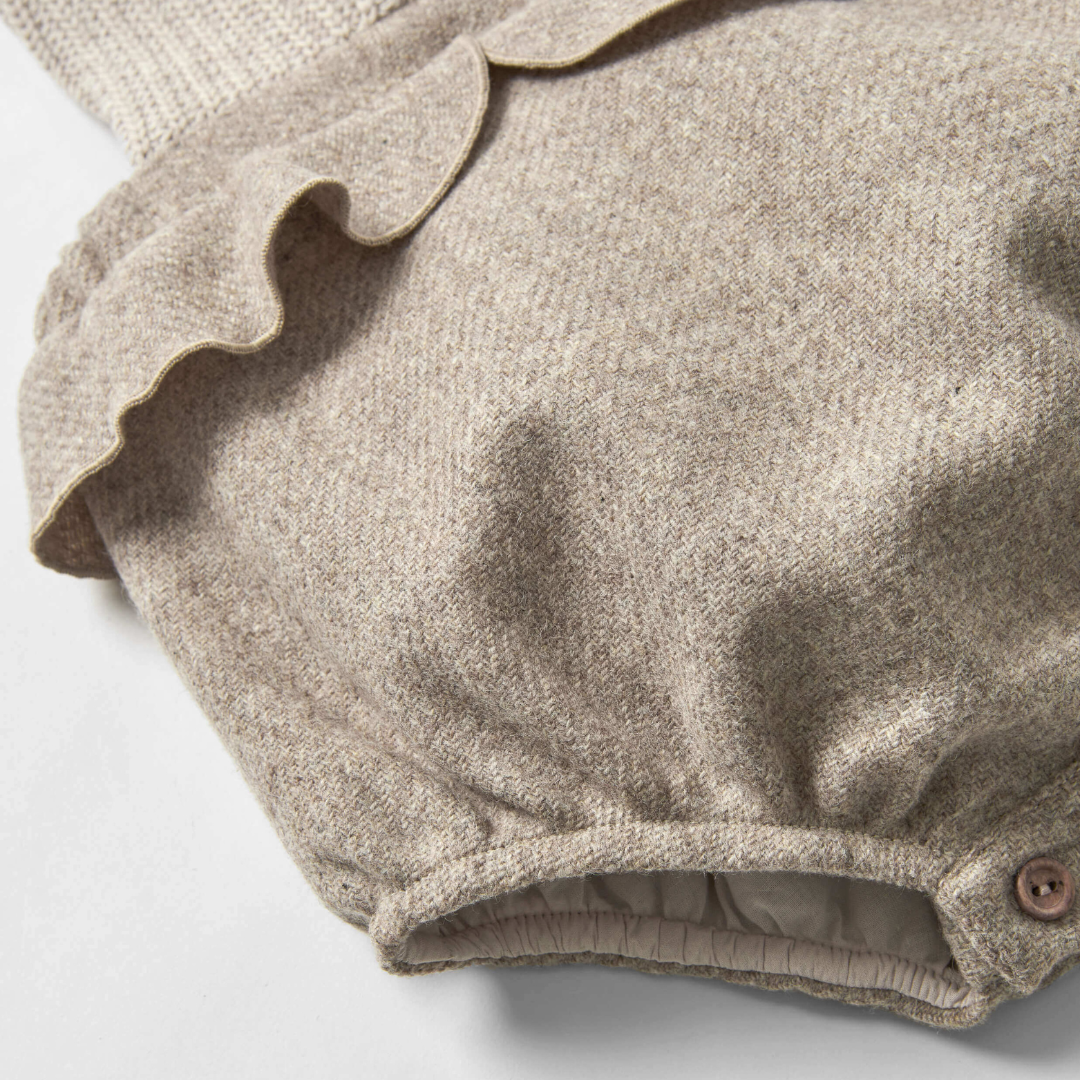 ウエストにふんわりあしらわれたフリルと、クラシックなデザインが目を引く「Romper suit with bib」。
